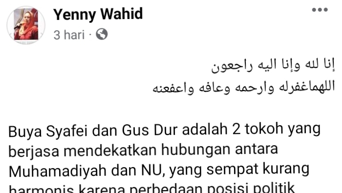 Yenny Wahid, puteri KH Abdurrahman Wahid (Gus Dur) menulis di Fanpage-nya, Jumat, 27/5/2022;