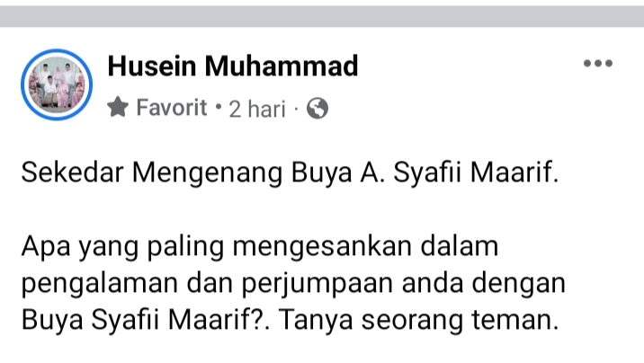Memang, sejak Buya Syafi’i Ma’arif wafat pada hari Jumat, 27/5/2022, tampak banjir ribuan ucapan belasungkawa dari warga Nahdliyyin yang turut merasa kehilangan sosok pemersatu bangsa itu di laman Facebook masing-masing.