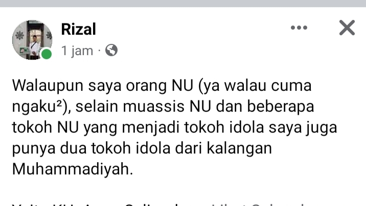 “Walaupun saya orang NU (ya walau cuma ngaku²), selain muassis NU dan beberapa tokoh NU yang menjadi tokoh idola saya juga punya dua tokoh idola dari kalangan Muhammadiyah.